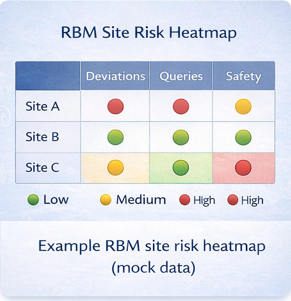 | Site | Deviations | Late Data | Query Rate | Risk Level |