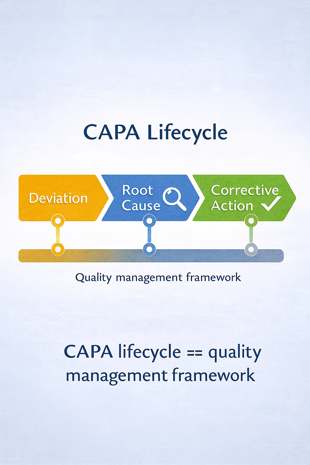 flowchart LR A[Deviation Identified] --> B[Root Cause Analysis] B --> C[Corrective Action] C --> D[Preventive Action] D --> E[Effectiveness Check] E --> F[Closure]